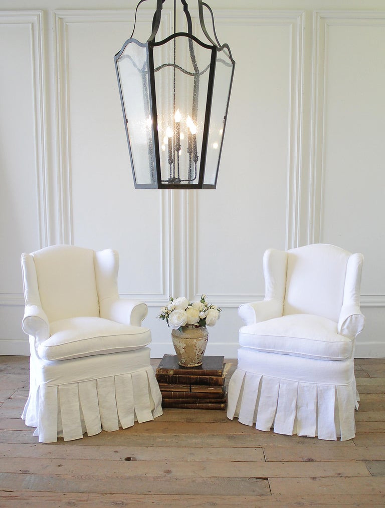 The long skirt on the slipcover hides the chair legs, bringing a sense of uniformity the chairs.
